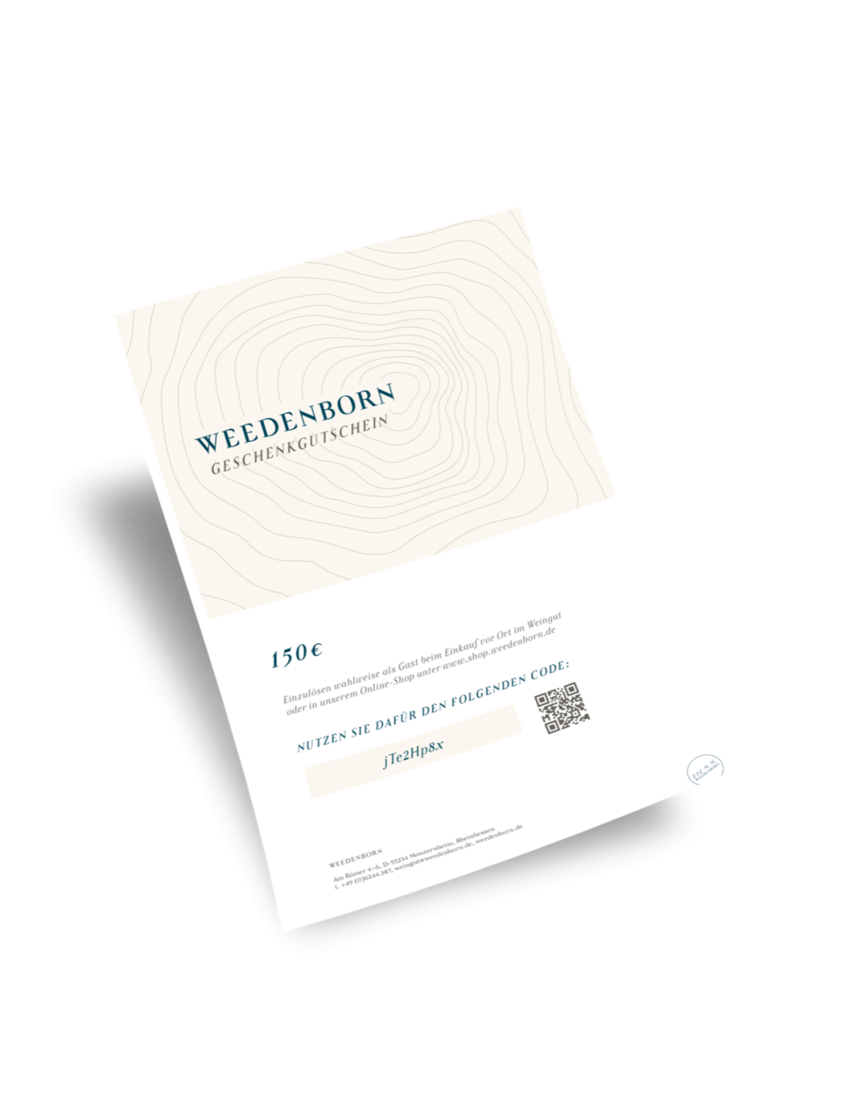 Unser Weedenborn-Gutschein kann im Webshop oder auf Weedenborn in unserer Vinothek eingelöst werden. Der Gutschein steht nach dem Kauf und der Bezahlung AUSSCHLIESSLICH VIA PAYPAL als PDF zum Download sofort zur Verfügung. Keine Auszahlung möglich.